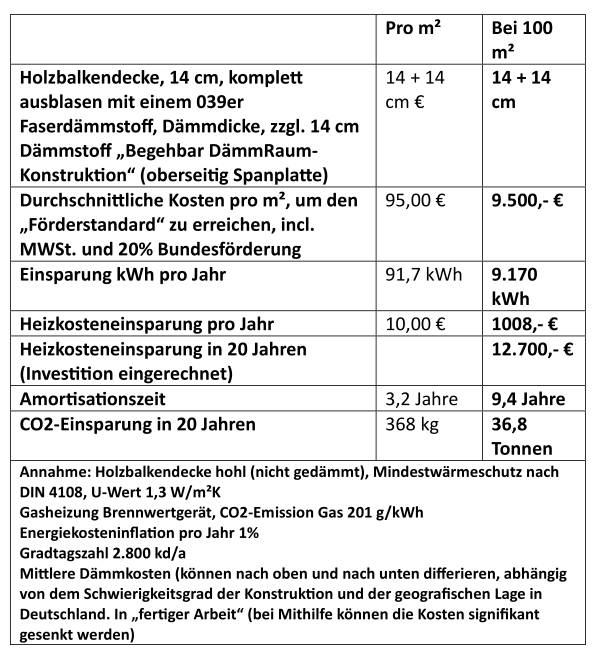 WärmeschutzBeträgt der U-Wert der oberen Geschoßdecke vorher ca. 1,3 W/(m²K), so kann er durch die Dämmmaßnahme auf ca. 0,14 W/(m²K) gesenkt werden. Dies bedeutet eine wärmetechnische Verbesserung des Bauteils „obere Geschoßdecke“ um ca. 90 %.