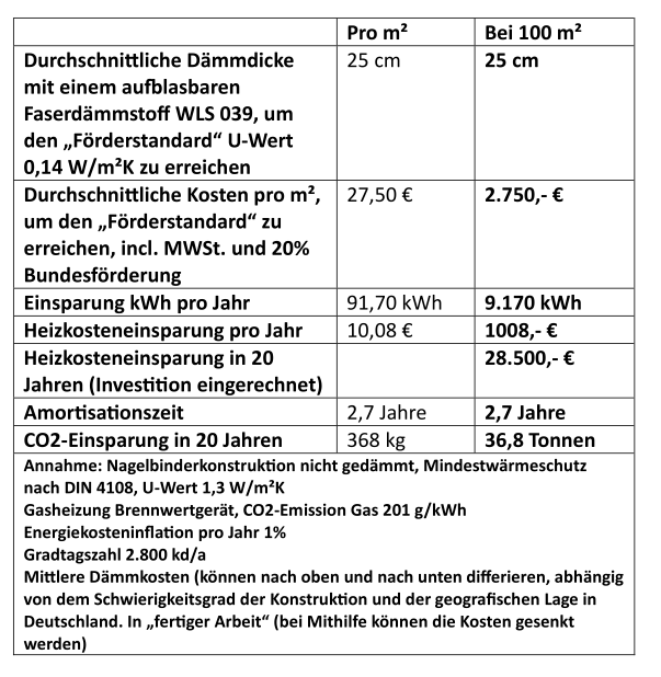Kosten/Wirtschaftlichkeit: Abhängig vom Schwierigkeitsgrad kann die gesamte Maßnahme bis zu 27,50 € pro m² (incl. Förderung und MWSt.) kosten. Der Wärmeschutz kann um bis zu 90% verbessert werden. Die Maßnahme amortisiert sich in einem Zeitraum von 2-3 Jahren.